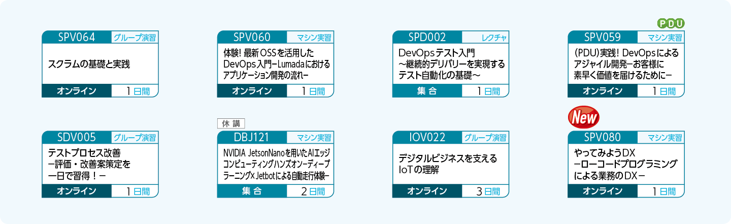 ラーニング×Jetbotによる自動走行体験― やってみようDX-ローコードプログラミングによる業務のDX- デジタルビジネスを支えるIoTの理解 (PDU)実践! DevOpsによるアジャイル開発-お客様に素早く価値を届けるために- DevOpsテスト入門-継続的デリバリーを実現するテスト自動化の基礎- 体験! 最新OSSを活用したDevOps入門―Lumadaにおけるアプリケーション開発の流れ― スクラムの基礎と実践 <eラーニング>AIマーケテイングの基礎 <eラーニング>AI・データサイエンス基礎 データ分析手法の理論と適用-ビジネスにおける統計的手法活用の広がり- <eラーニング>AIリテラシー-AI技術の概要と活用事例- 定量分析のスキル <eラーニング>データ分析手法の理論と適用