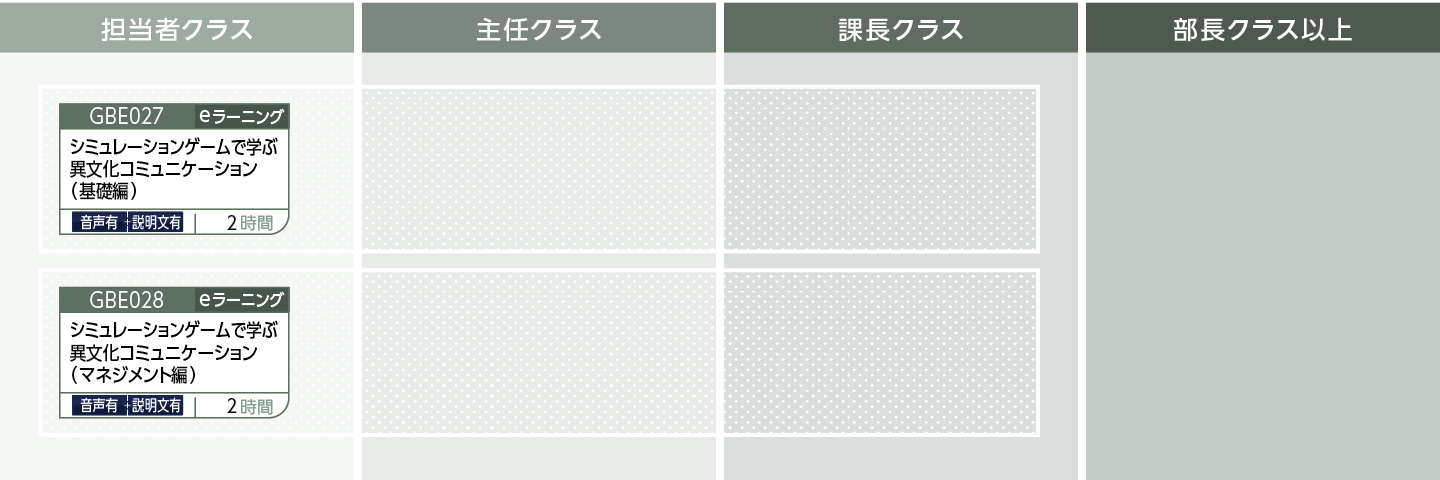 <eラーニング>(PDU)インドビジネスの鉄則 <eラーニング>シミュレーションゲームで学ぶ異文化コミュニケーション(マネジメント編) <eラーニング>シミュレーションゲームで学ぶ異文化コミュニケーション(基礎編) <eラーニング>多様性の理解(グローバルナビゲーター)-B. ロシア、インド、イスラム編- <eラーニング>多様性の理解(グローバルナビゲーター)-D. アメリカ、オセアニア編- <eラーニング>多様性の理解(グローバルナビゲーター)-C.ヨーロッパ編- <eラーニング>多様性の理解(グローバルナビゲーター)-A.アジア編- <eラーニング>(PDU)グローバルビジネスの基礎-ビジネスルールと多様性-(基本セット)