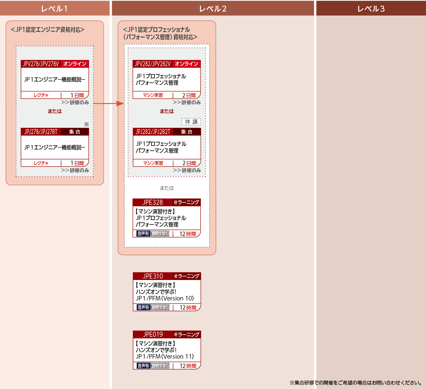 - 「>>研修のみ」は、「集合研修」の申し込みで、研修終了後に開催するJP1試験の受験を付けないコース詳細ページのリンクとなります。