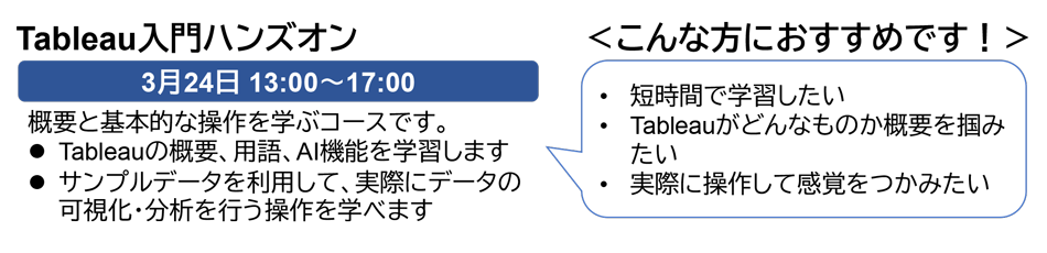 TableauはBI(Business Intelligence)分野での代表的な製品で、エンドユーザー自身によるデータ分析の支援を行い、業務での意思決定に活用できます。このTableauの導入を検討する企業も多くありますが、そのためには機能や操作の理解が必要です。そこで、3月に半日で学べるハンズオン研修コースを開催いたします。お手元のPCで実際にTableauを操作するハンズオンと座学の組み合わせで、Tableauについて概要と基本的な操作を学べます。Tableauとは何かをまず学んでみたいという方におすすめです。