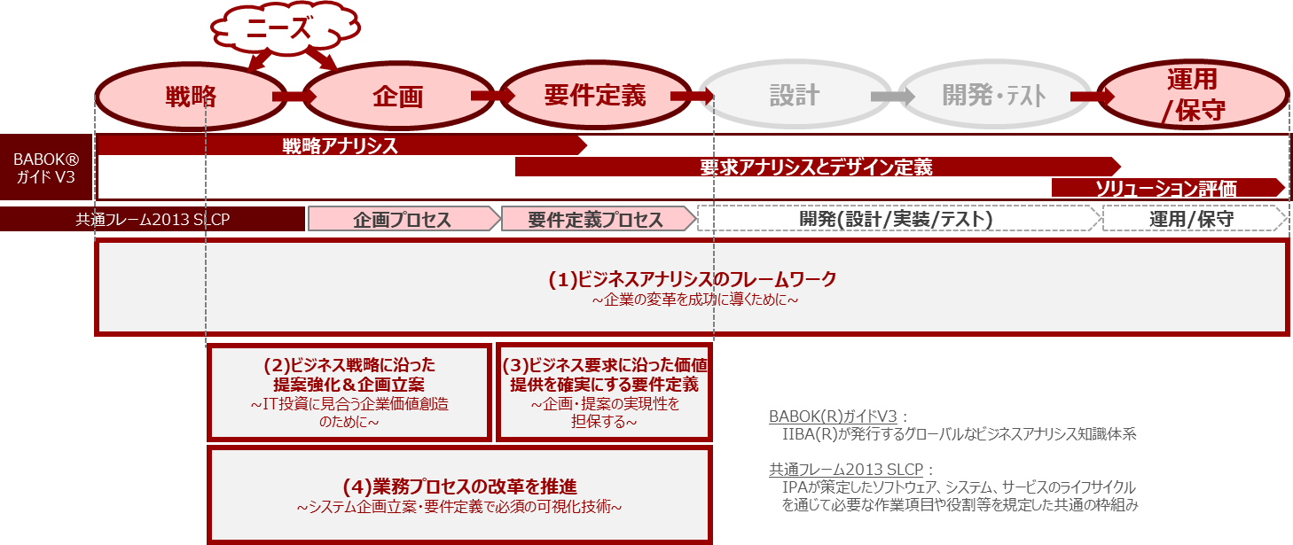 顧客ニーズが従来の業務支援から既存事業の高度化、新規事業の創出など『新たなビジネス価値創出』へと拡大する中、企業はビジネス価値に直結する革新的なソリューションを顧客へ提供していく必要があります。そのためには、顧客の潜在的ニーズ・課題を分析し、企業視点でビジネス要件を明確化し、それを満たすソリューションを企画として纏め、具体的な要件定義へ落とし込むビジネスアーキテクト人財の役割が今後ますます重要となります。