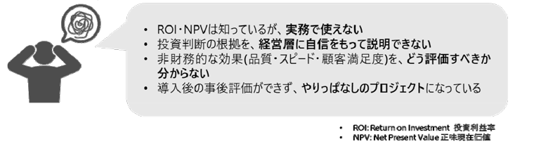 本コースは、IT投資や業務施策がもたらすビジネス価値を定量的に評価し、戦略的な意思決定に活かすことを目的としています。本コースでは、IT投資効果の評価方法として広く取り入れられている主要な手法について、それぞれの基本的な考え方や特徴、違いを学習します。さらに、グループ演習を通じて、評価手法の実践的な使い方への理解を深めます。